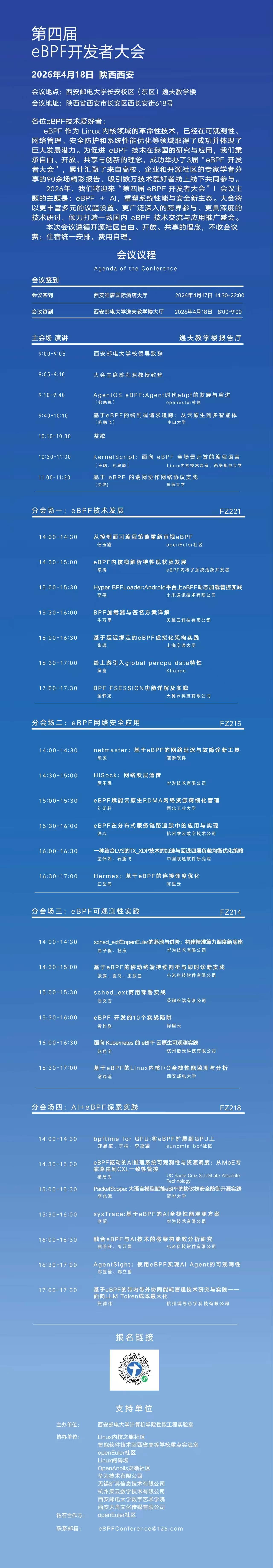 “第四届eBPF开发者大会”将于2026年4月19日在陕西省西安市线下召开,由西安邮电大学主办。本次大会以“eBPF深度赋能,引领系统性能与安全新时代”为主题,涵盖了eBPF技术及发展、eBPF在网络及安全的应用、eBPF可观测性及应用、性能优化与工程实践等方面,汇聚了来自南京大学、华为、阿里、字节跳动、麒麟软件等知名高校、企业和开源社区的专家学者的36场精彩报告,为您提供全方位的技术视野和深度研讨空间。除了权威讲师的精彩演讲和深度技术分享之外,本次会议特别准备了eBPF项目集市、现场演示和经验交流讨论,让您能够在与行业专家紧密互动的同时,开拓思维、解决问题。